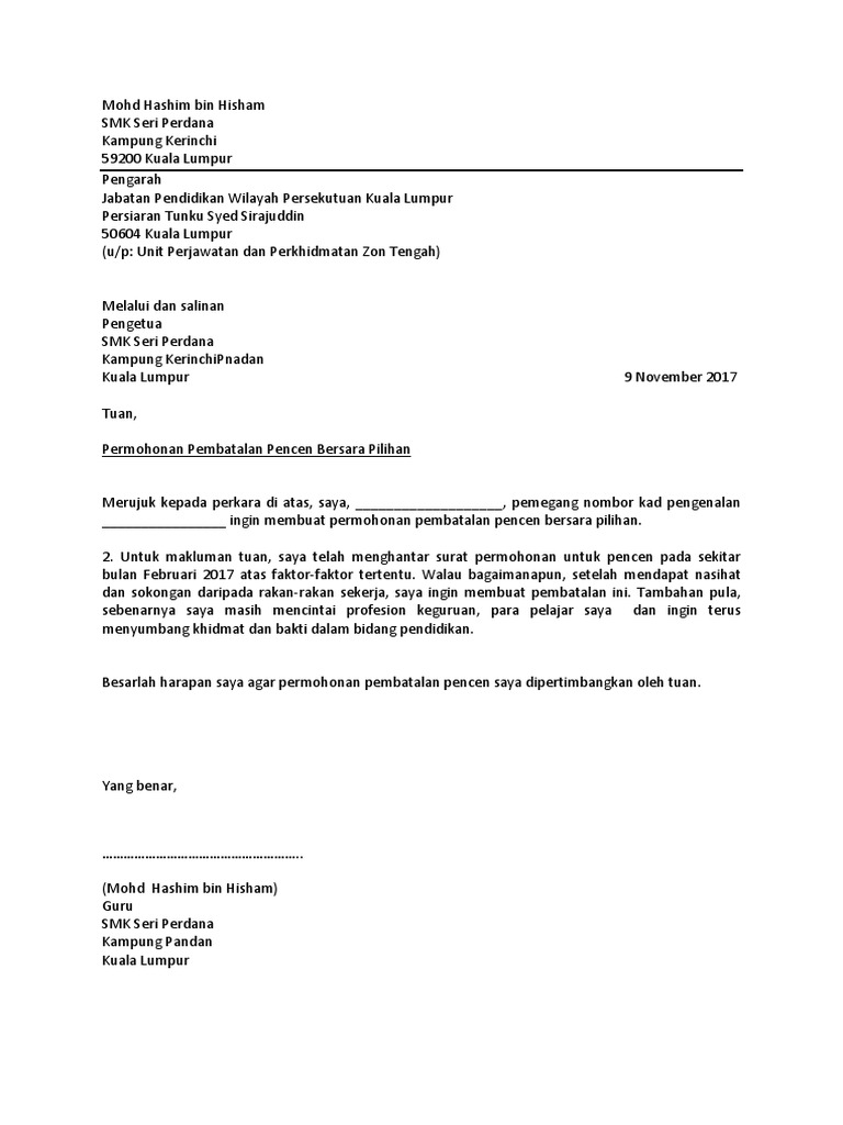 Contoh Surat Mohon Bersara Pilihan : Panduan Memohon Bersara Pilihan Bersara Awal Pendidik2u - Check spelling or type a new query.. Maybe you would like to learn more about one of these? Check spelling or type a new query. Contoh surat mohon bersara pilihan. We did not find results for: